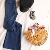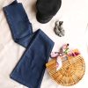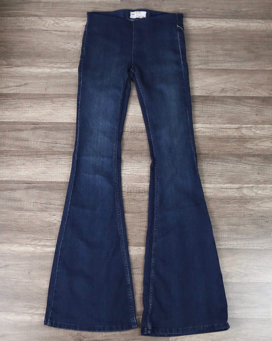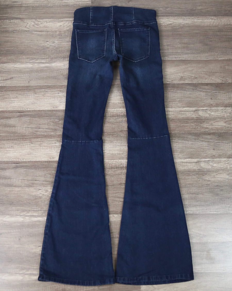 Classic Loosemaxiskirt pull-on flare jeans featured in a clean silhouette with an extreme flare with a slight stretch. Back pockets and back knee seam detailing. This mid-rise style has an elastic waistband for an easy fit.