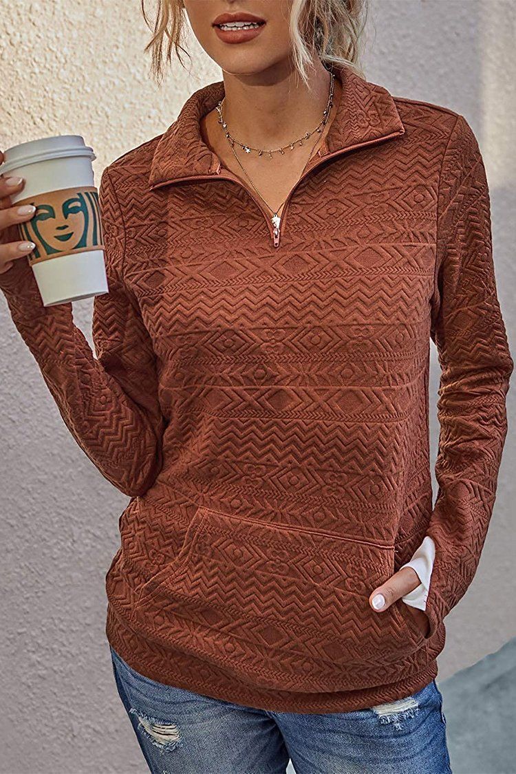 Quilted Pattern Quarter Zip Loose Sweatshirt with Pocket