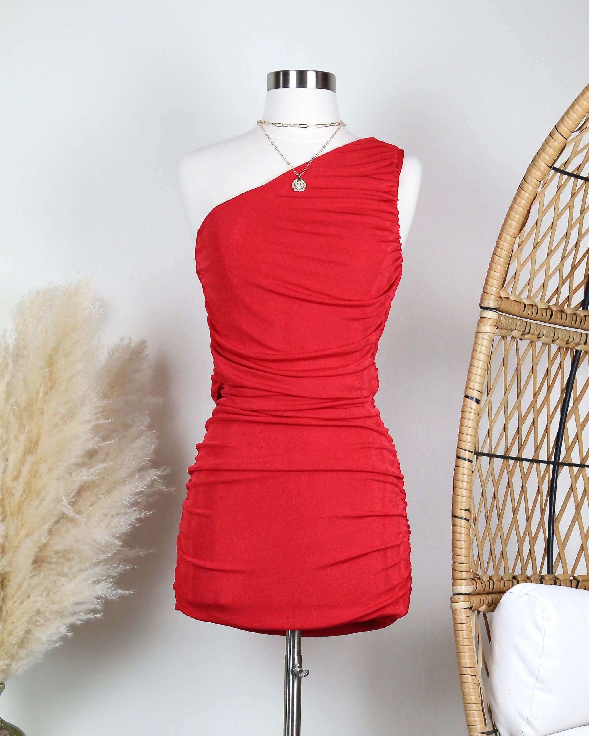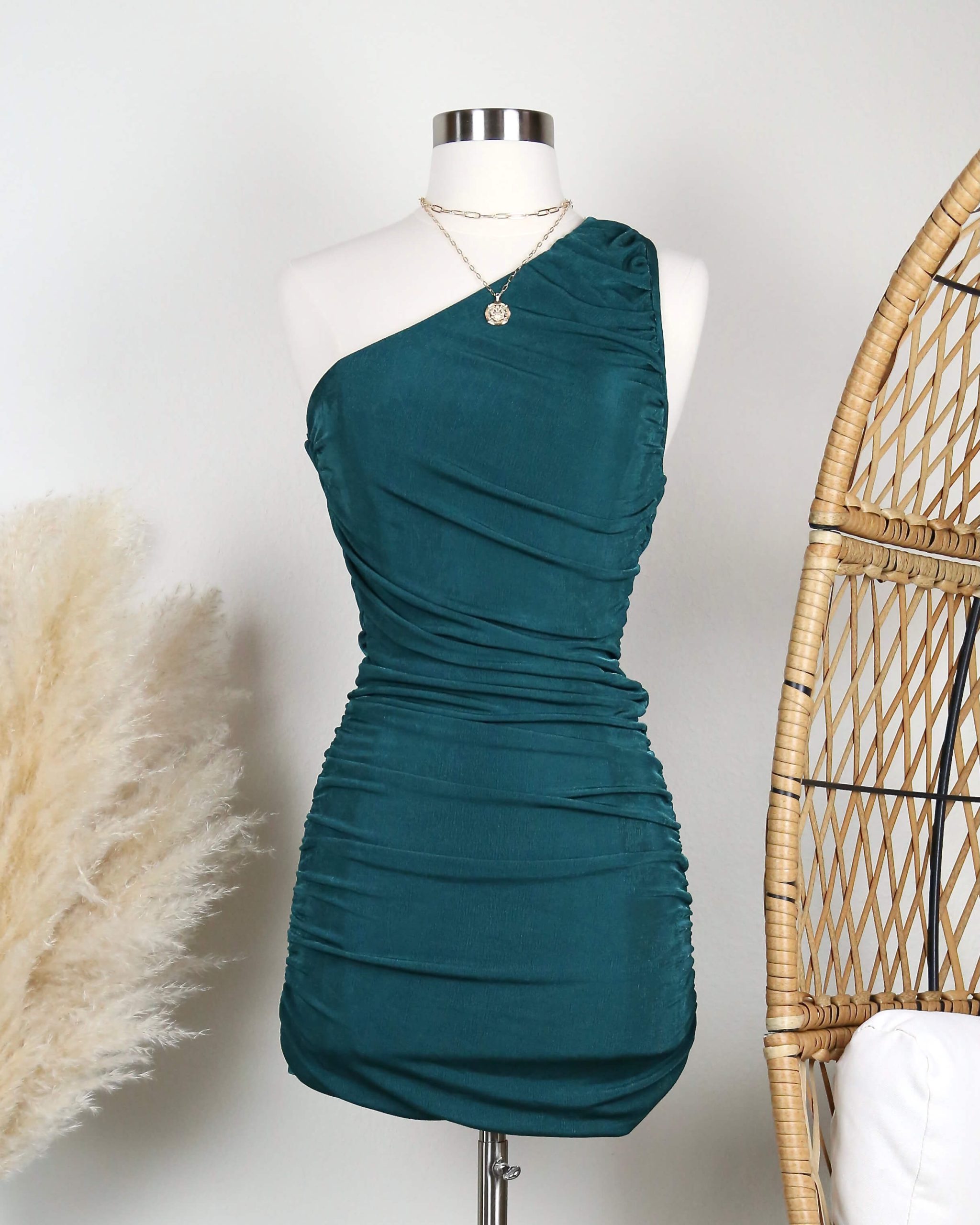The Goddess Ruched One Shoulder Mini Dress in More Colors
