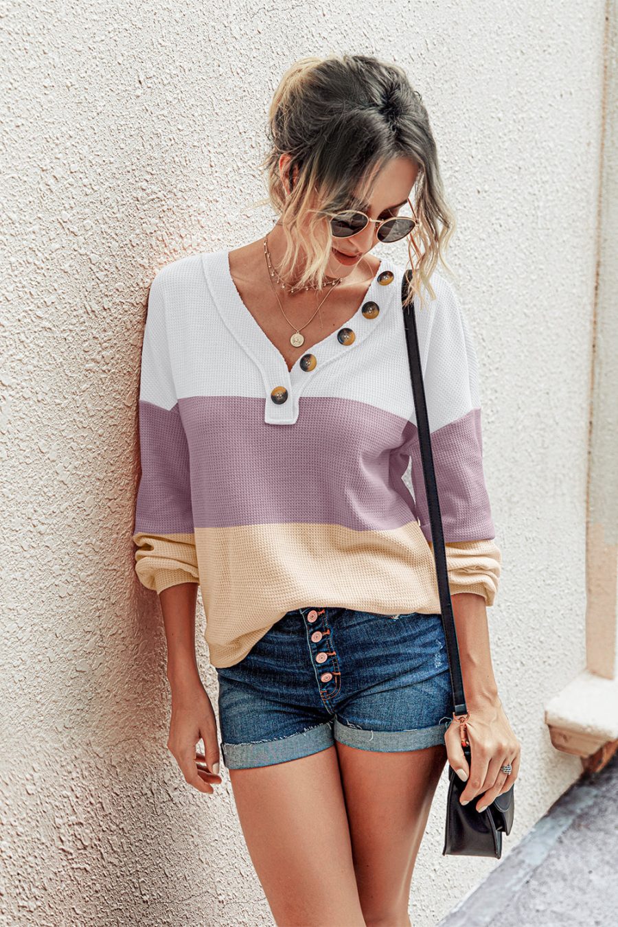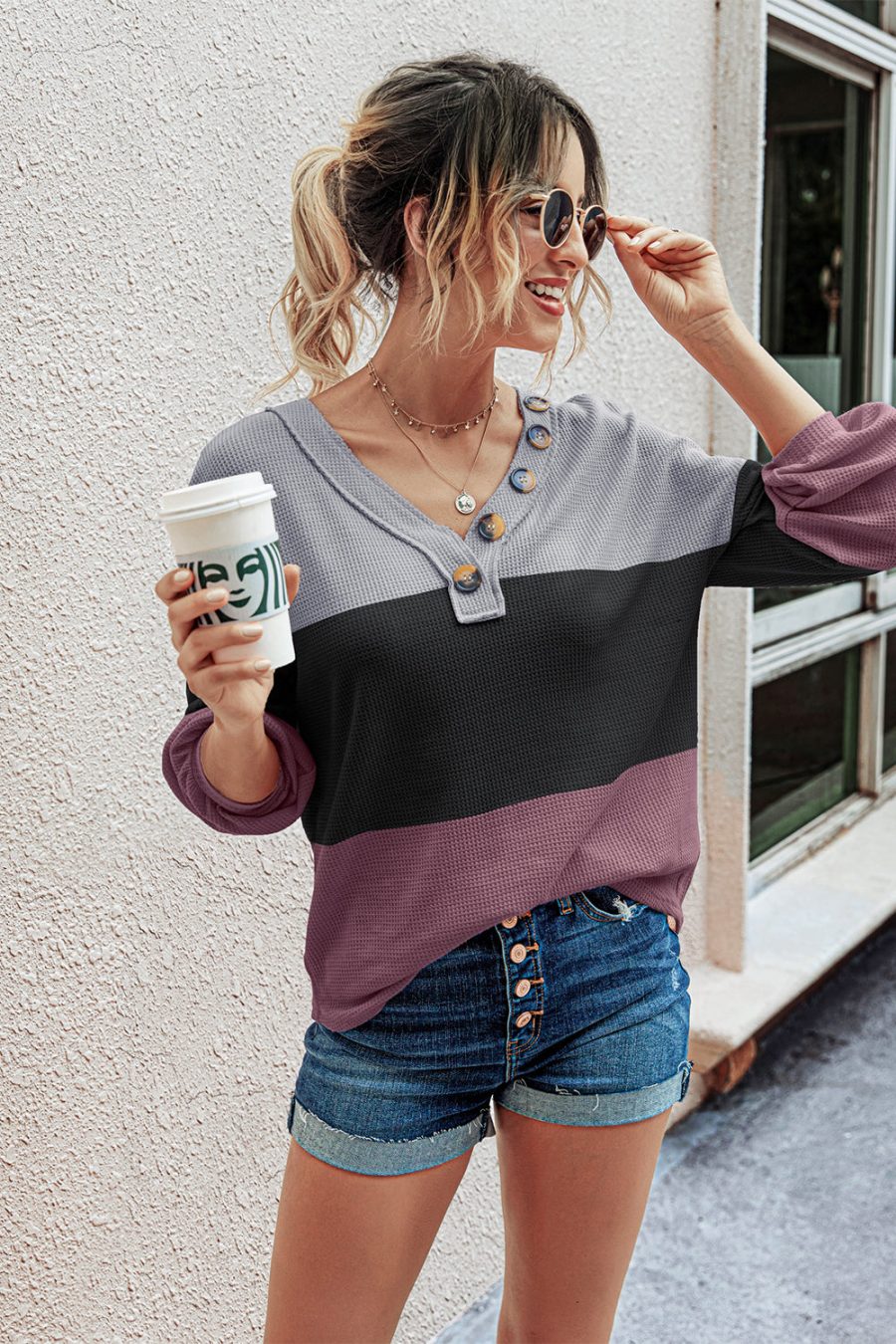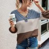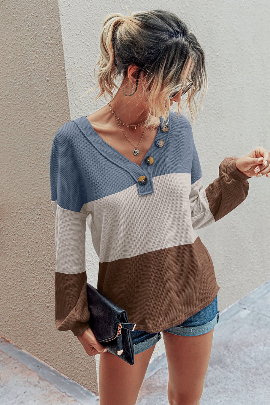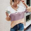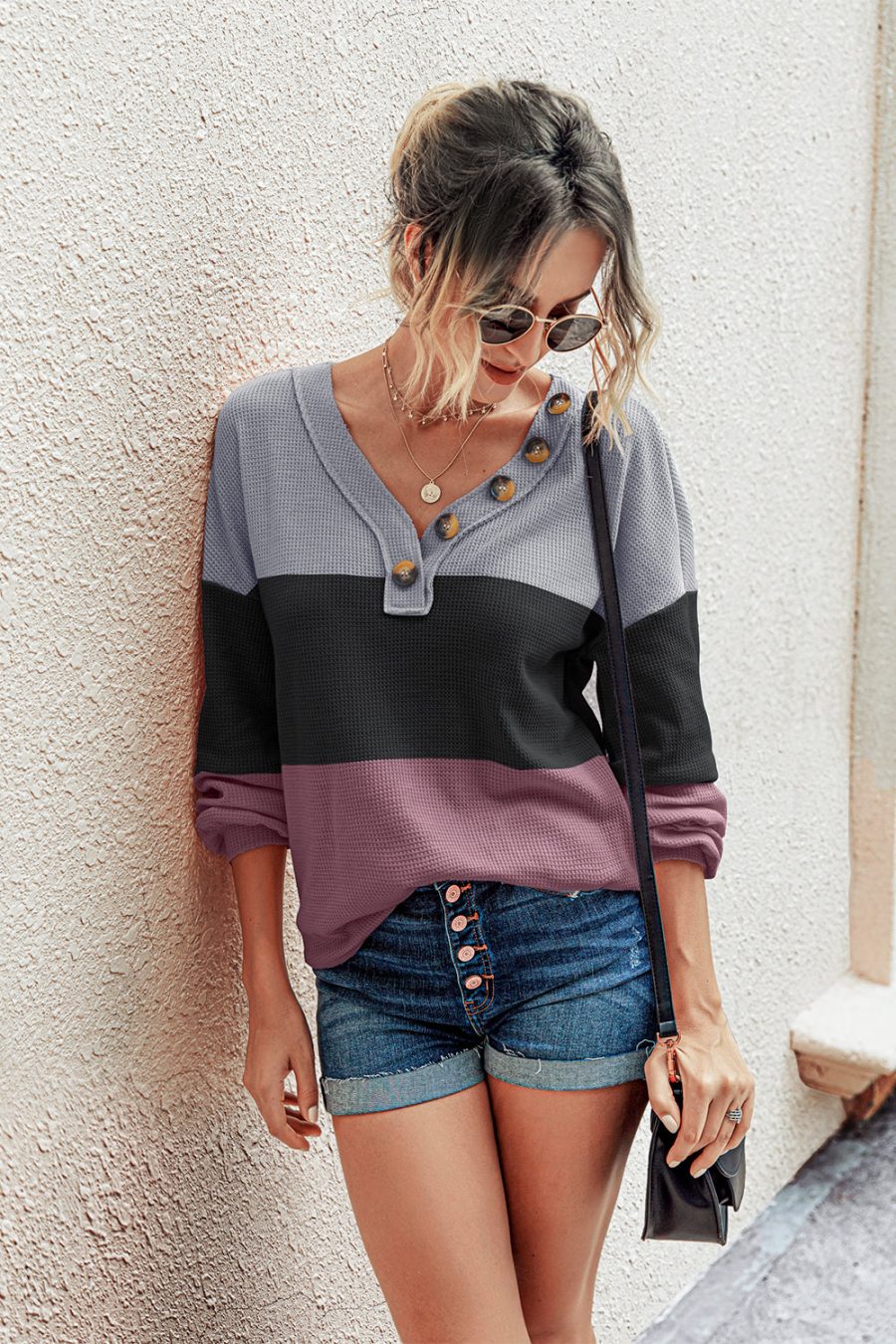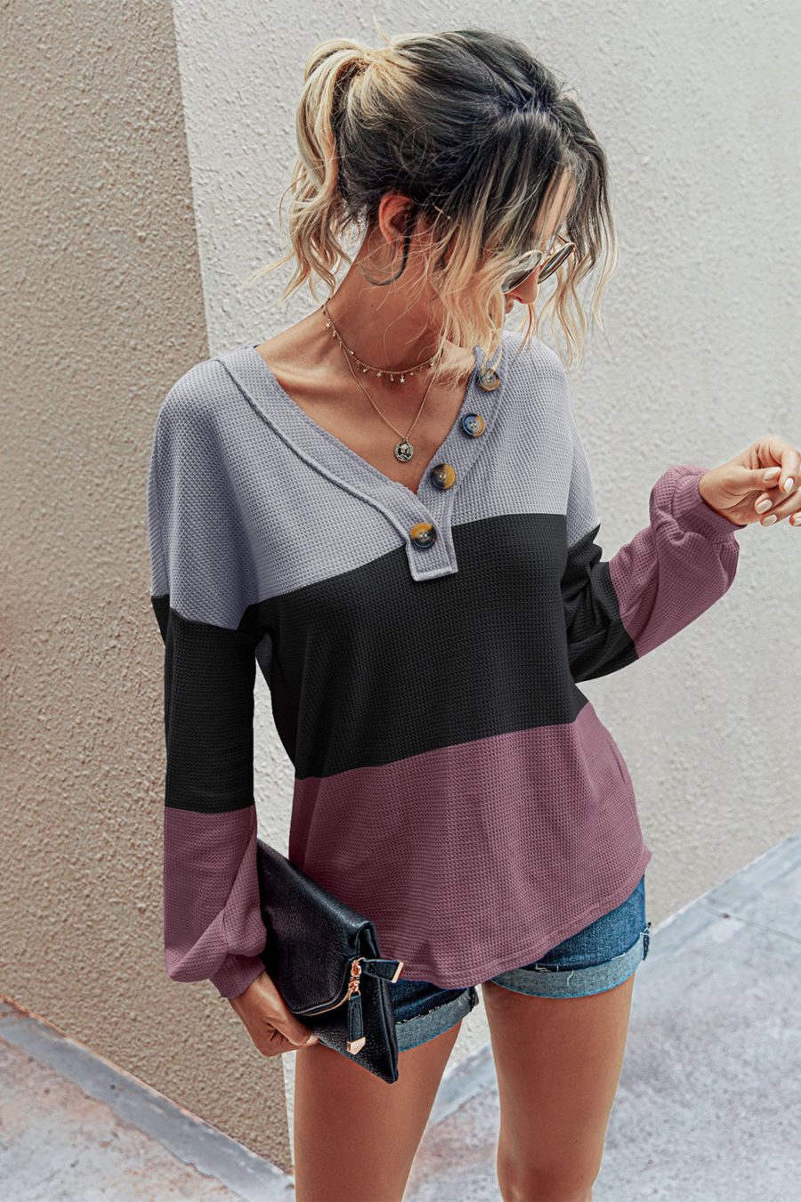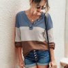 Short Sleeve V Neck Button Ribbed Knit T-shirt