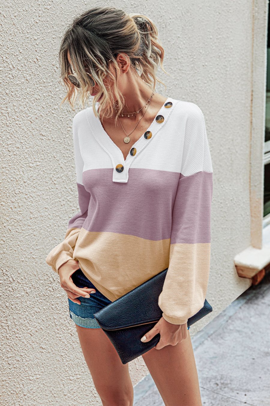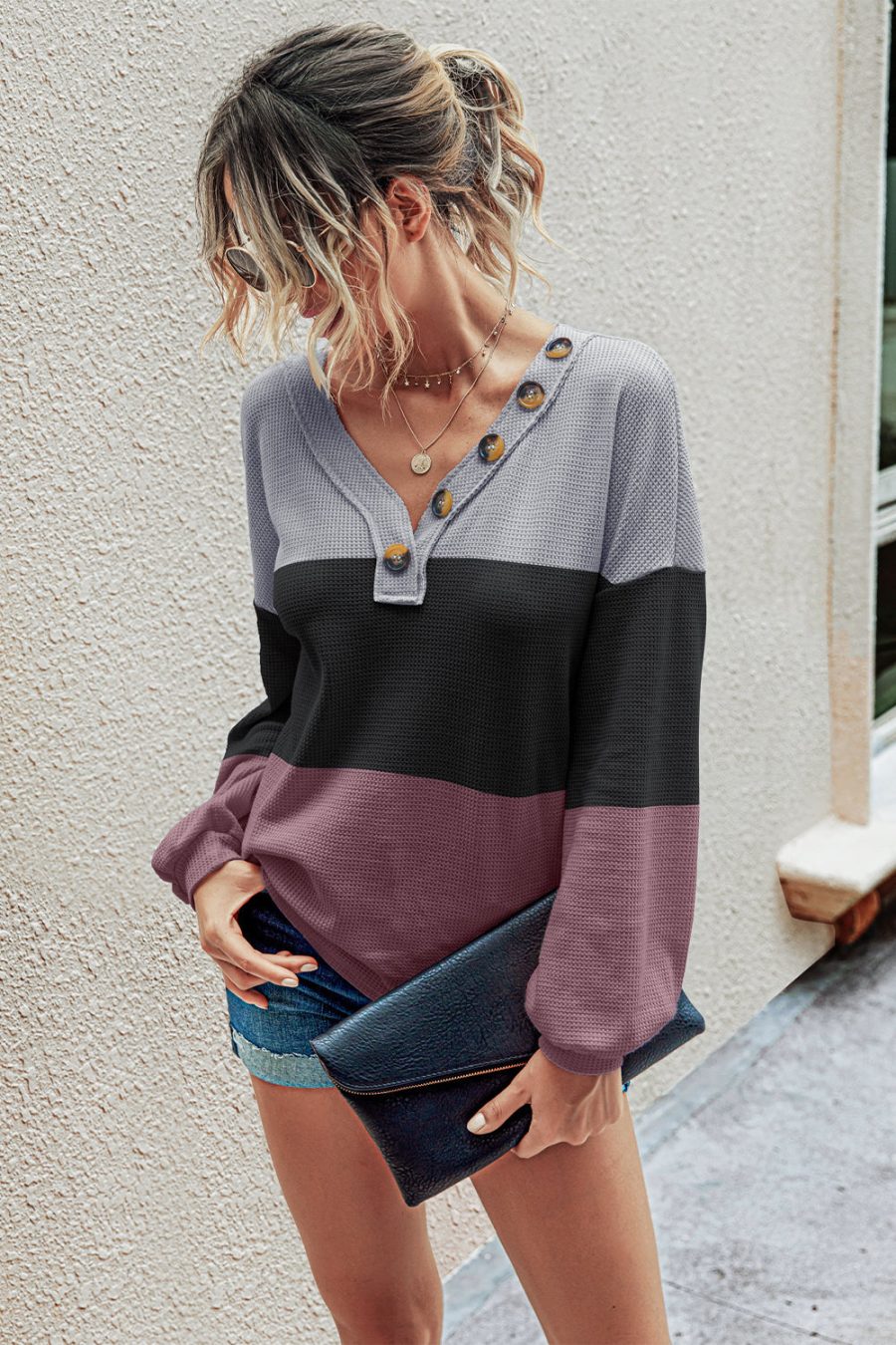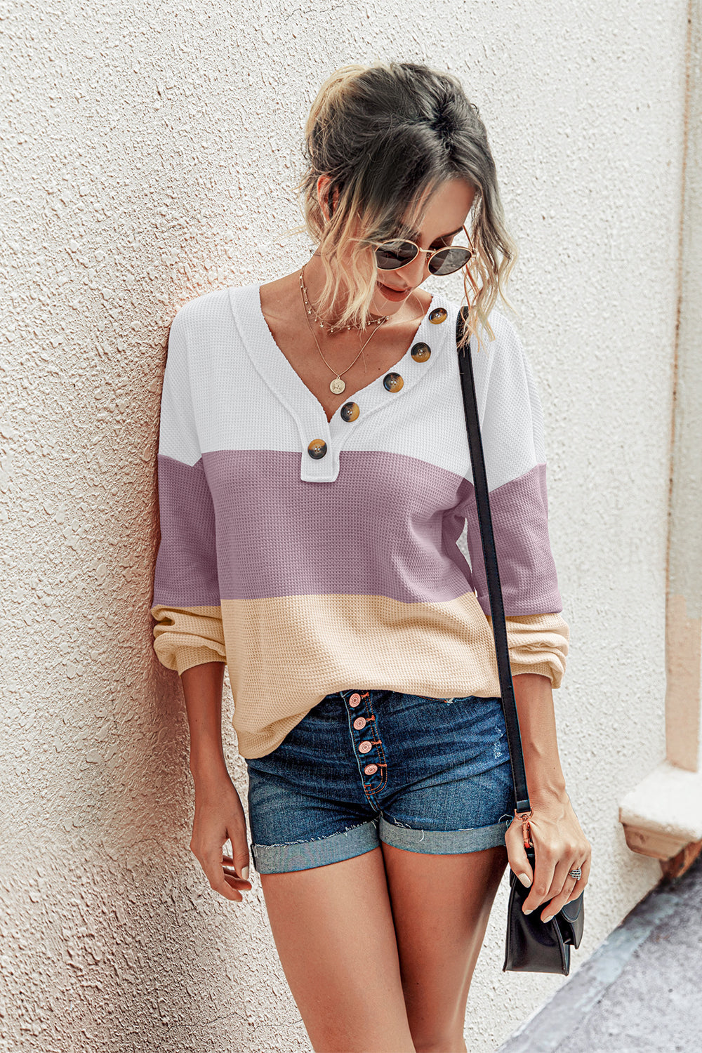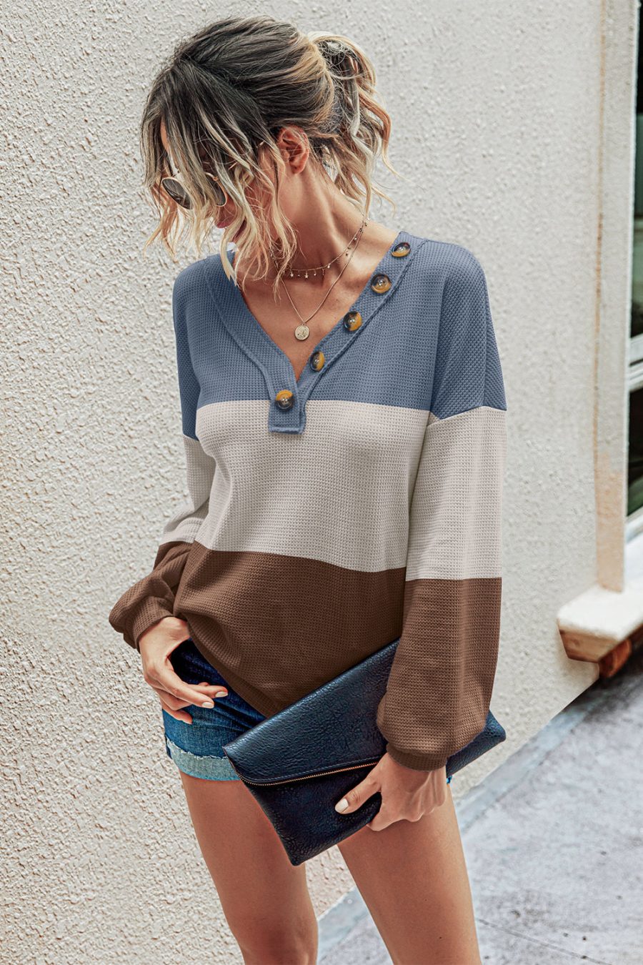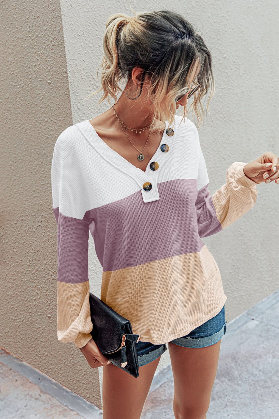 Short Sleeve V Neck Button Ribbed Knit T-shirt