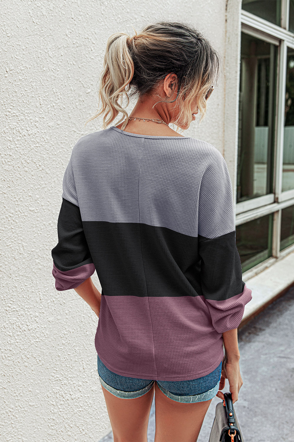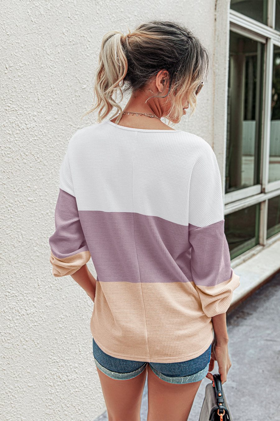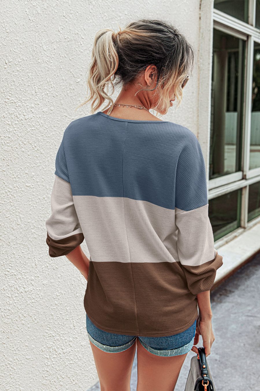 V Neck Button Raglan Sleeves Striped Blouse quantity